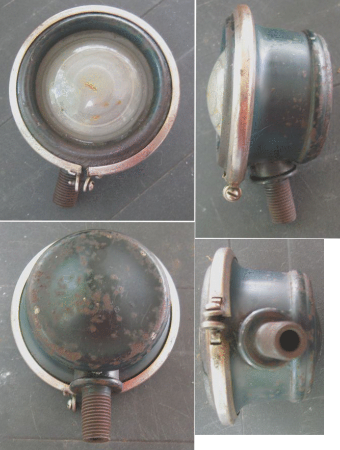 Grey housing with Glass Lens, 4" dia. x 3 1/4" deep from front of bezel, Has post mount, Used - Good