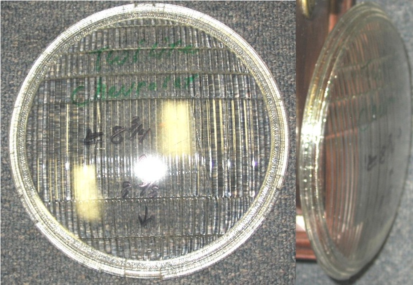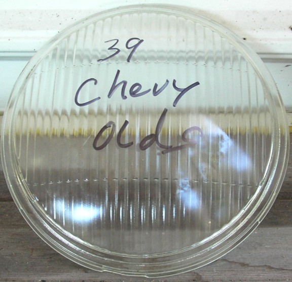 | Twilite-Chevrolet | 33? | Lens, Clear Glass Headlight, Fits Chevrolet Cars, 8 3/4" Total Dia x 8 1/4" Lens Dia. x very slight bubble & a shallow notch at the bottom, Used - Good Condition (have 0) |