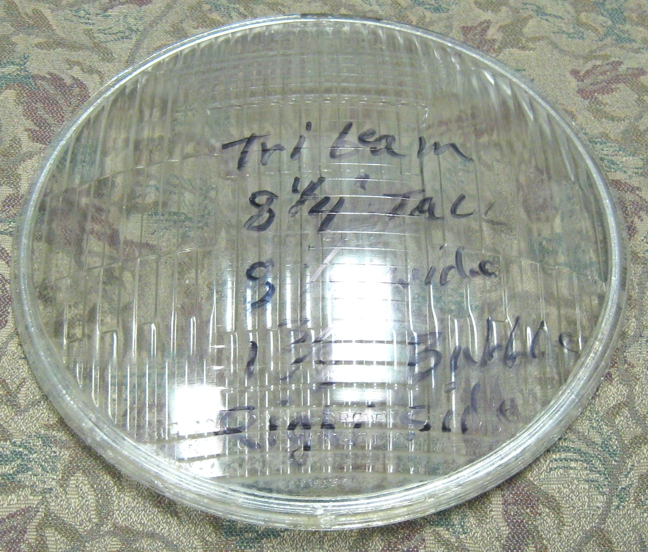 | Tribeam | ? | Lens, Clear Glass Headlight, Fits ? Cars, 8 1/4" Tall x 8 1/8" wide x 1 3/8" bubble, Used - Good except for a chip on top edge (have 0) |