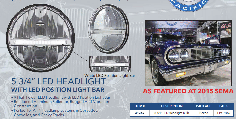 | 31267 | 12 Volt LED | 5 3/4” LED HEADLIGHT WITH LED POSITION LIGHT BAR • 9 High Power LED Headlight with LED Position Light Bar • Reinforced Aluminum Refl ector, Rugged Anti-Vibration Construction • Perfect for All 4 Headlamp Systems in Corvettes, Chevelles, and Chevy Trucks White LED Position Light Bar (In Stock) |