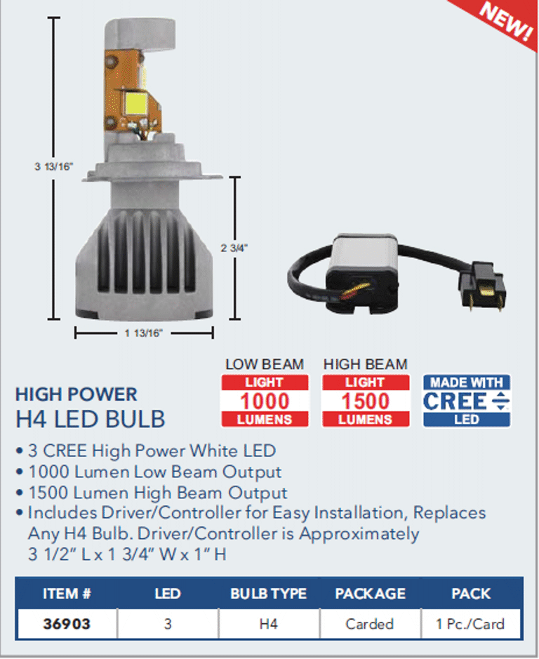 | 36903 | Headlight | High Power H4 LED Bulb, 3 CREE High Power White LED, 9W Low Beam Application, 18W High Beam Application, 1000 Lumen Low Beam Output 1500 Lumen High Beam Output, Includes Driver/Controller for Easy Installation, Replaces Any H4 Bulb. Driver/Controller is Approximately 3 1/2” L x 1 3/4” W x 1” H, Warranty 6 Months (In Stock) |