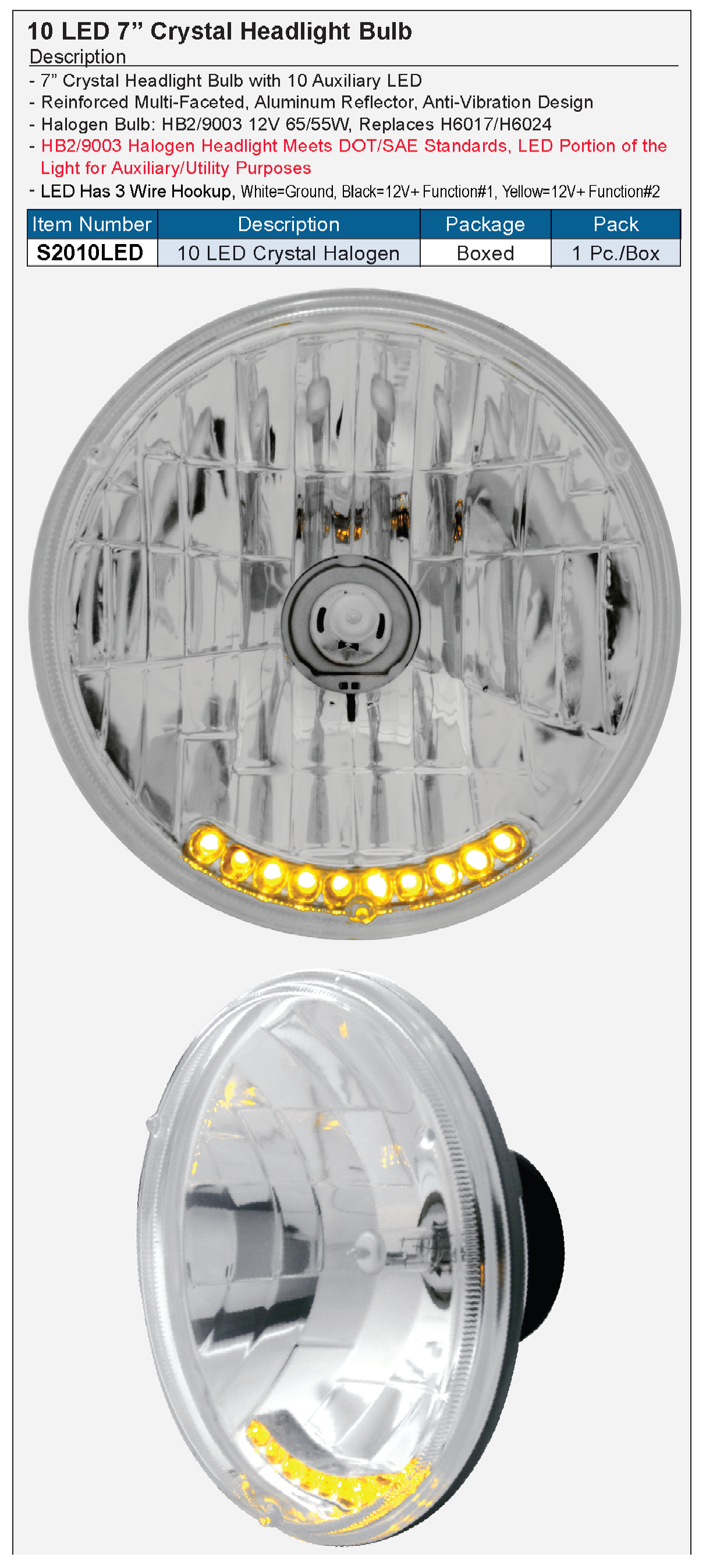 | S2010LED | All with 7" | Headlight Bulb Assembly, Crystal lens and Metal reflector, 7" diameter, with H4 dual element 12 Volt bulb, with 10 Amber LED light in bottom for park & turn signals, Fits all headlights with 7" bulb, These look way cool!! (Have 12 In Stock!) |