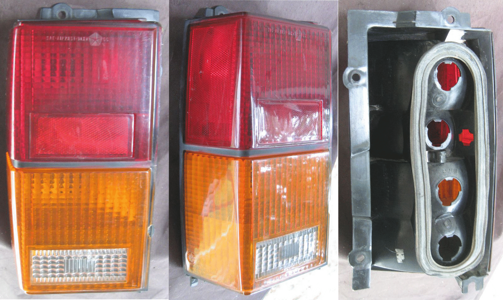 | AJ | 74-84 | Taillight | Lens, Jeeps, with backup, 10 1/4" tall x 3 1/4" wide, Used - 2 are Excellent condition - no cracks or spidering & 1 has bottom screw hole broken out (have 3) |