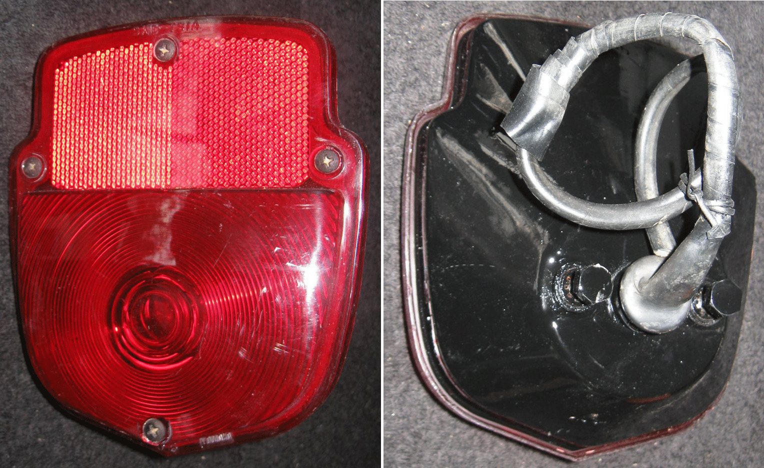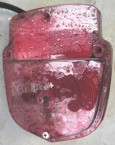 | TMC148 | 53-56 | Taillight | Assembly, Shield type, Black body, Left Hand with License Lens & Mounting strap (Approx. 5 1/2" wide x 6 1/2" long x 3" 1/4 deep) Used - some paint peeling and minor scratches on lens (Have 2) |