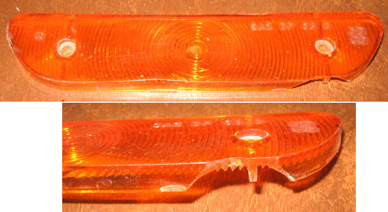 | 67D | 67 | Parklight | Lens, RH, Dodge Polara all models, Amber, 6 7/8" wide x 1 3/4" tall, Used - Nice lens with minor weathering (have 2) |