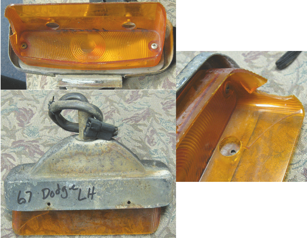 | 67D | 67 | Parklight | Assembly, LH, Dodge Polara all models, 6 7/8" wide x 1 3/4" tall, used - lens has a chunk broken out of the side of hood and a crack in the hood. otherwise very nice light (have 1) |